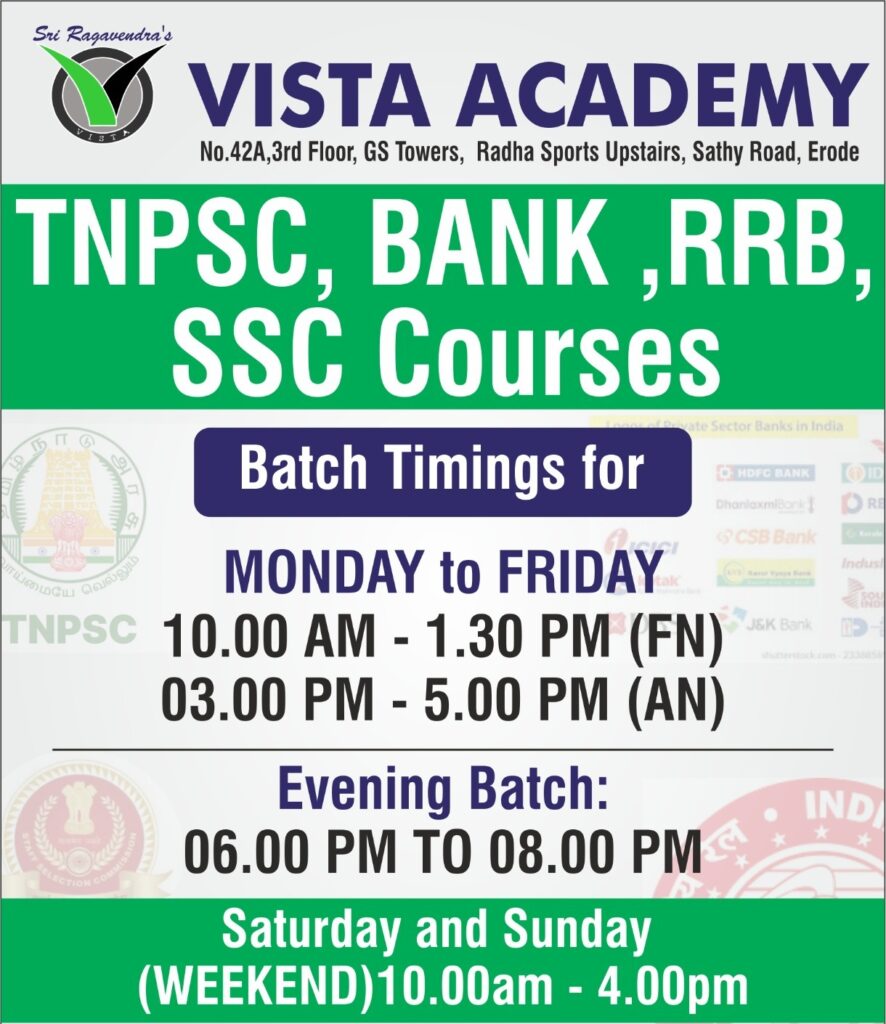 • Your journey to TNPSC success begins with a single step. Enroll at VISTA ACADEMY, the best TNPSC and TRB Polytechnic coaching centre in Erode & Salem to immerse yourself in an environment that fosters creativity, critical thinking, and holistic learning. With our signature techniques brainstorming, metacognitive strategies, mind mapping and online tests with progress index, you’ll not only be well-prepared for the exams but also equipped with life-long learning skills. Join us today and pave your way to a brighter future in Tamil Nadu Public Service Commission examinations.